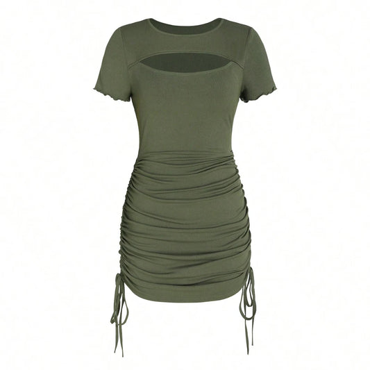 2025 Solid Color One-Piece Dress with Side Drawstring Pleats Chest Slit Slim Fit Polyester Material for Women